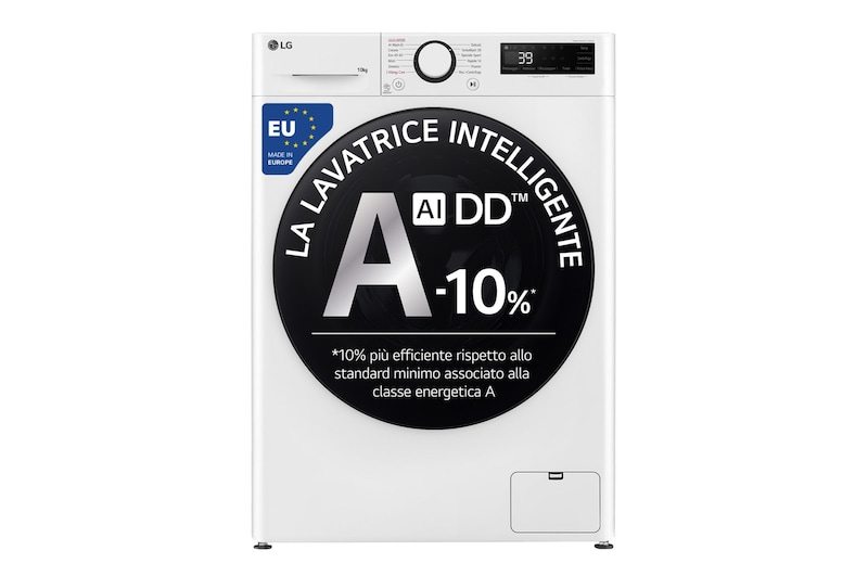 Lavatrice LG con efficienza energetica A-10%, posizionata a sinistra di una freccia verde crescente.