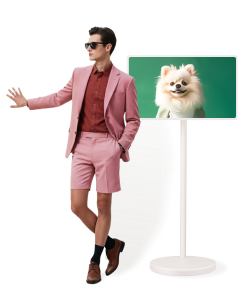 Un uomo con un completo rosa atterra con un paracadute e cammina con sicurezza in un’arena come su una passerella, portando sulla spalla l’LG StanbyME 2 come fosse una borsa elegante. Lo appoggia su un supporto, rivelando che non è una borsa ma lo schermo StanbyME 2. Appare il logo LG e il video si conclude con lui seduto su una sedia mentre guarda la scena della passerella.