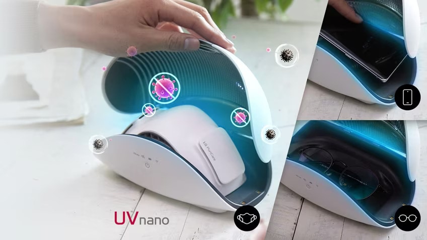 Вместе с LG PuriCare вы можете приобрести ультрафиолетовый футляр UVnano. Он будет одновременно заряжать ваш очиститель и поддерживать его гигиеническую чистоту с помощью ультрафиолетовых светодиодных ламп, которые убивают до 99,9% бактерий всего за 30 минут. Его возможно использовать для дезинфекции других небольших предметов, таких как смартфон или очки.