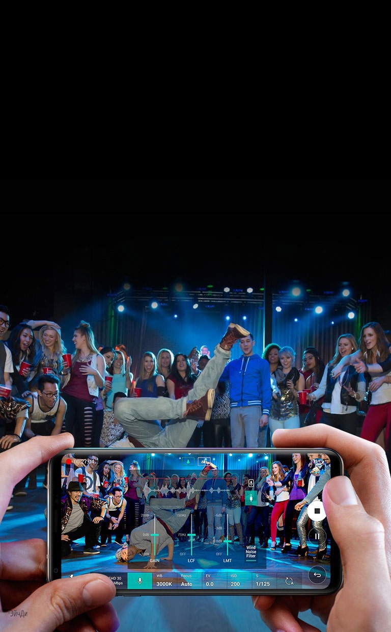 Записывайте не только видео, но и аудио HD¹ качества, где бы вы ни находились. Даже на записях с шумной вечеринки звук останется четким и чистым благодаря чувствительным микрофонам LG V30 .