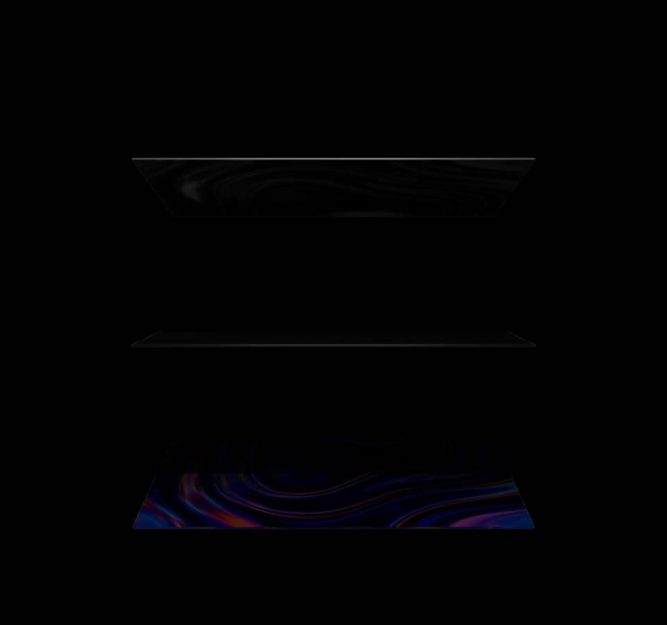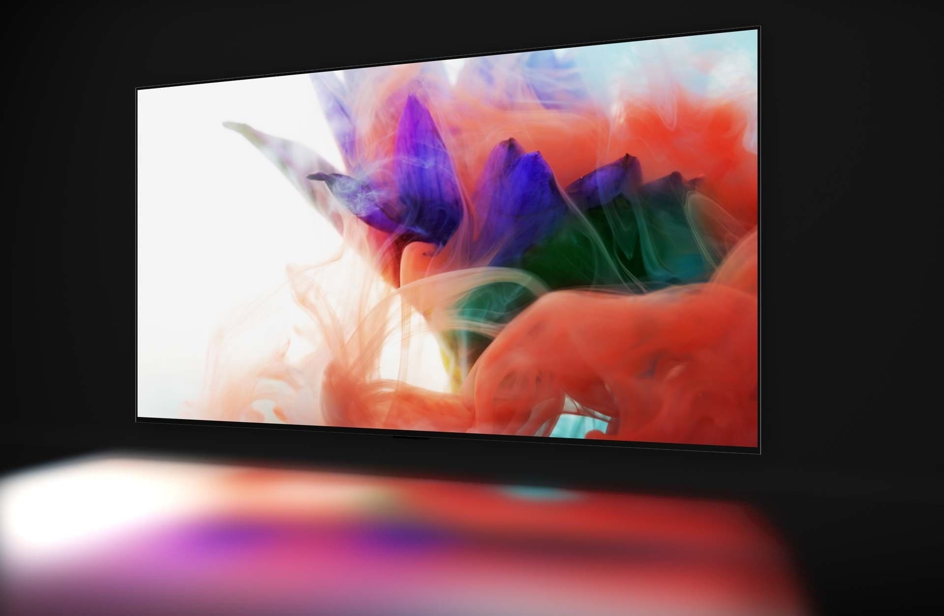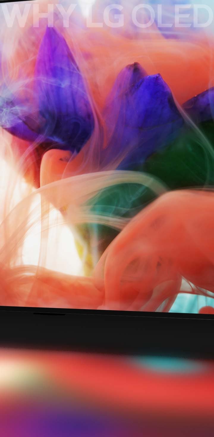 „LG OLED evo“ televizorius pasirodo iš šešėlio, tada užpildo ekraną spalvingu abstrakčiu gėlių atvaizdu, ant kurio yra užrašas „Tai – „OLED evo“ pranašumas“