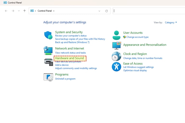 Sélectionnez ‘Hardware and Sound’ (Matériel et son) dans le panneau de commande.