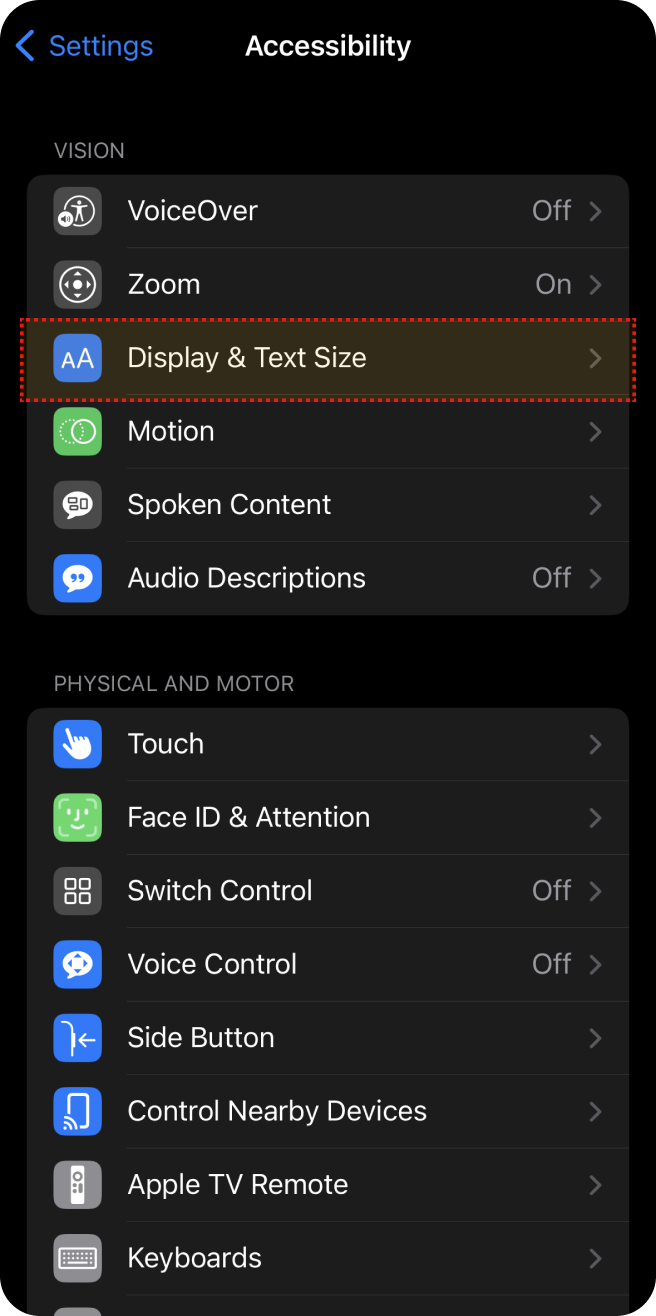 Sélectionnez ‘Display & Text Size’ (Affichage et taille du texte) dans 'Accessibility' (Accessibilité).