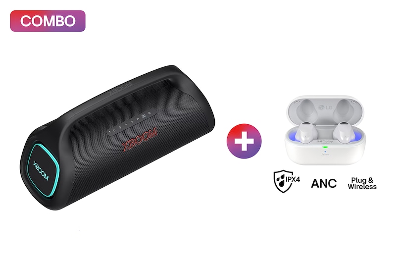 Bocina Bluetooth portátil LG XBOOM Go XG9QBK IP67 y batería de 24 horas de duración + LG TONE Free T90S con Dolby Atmos y Dolby Head Tracking™