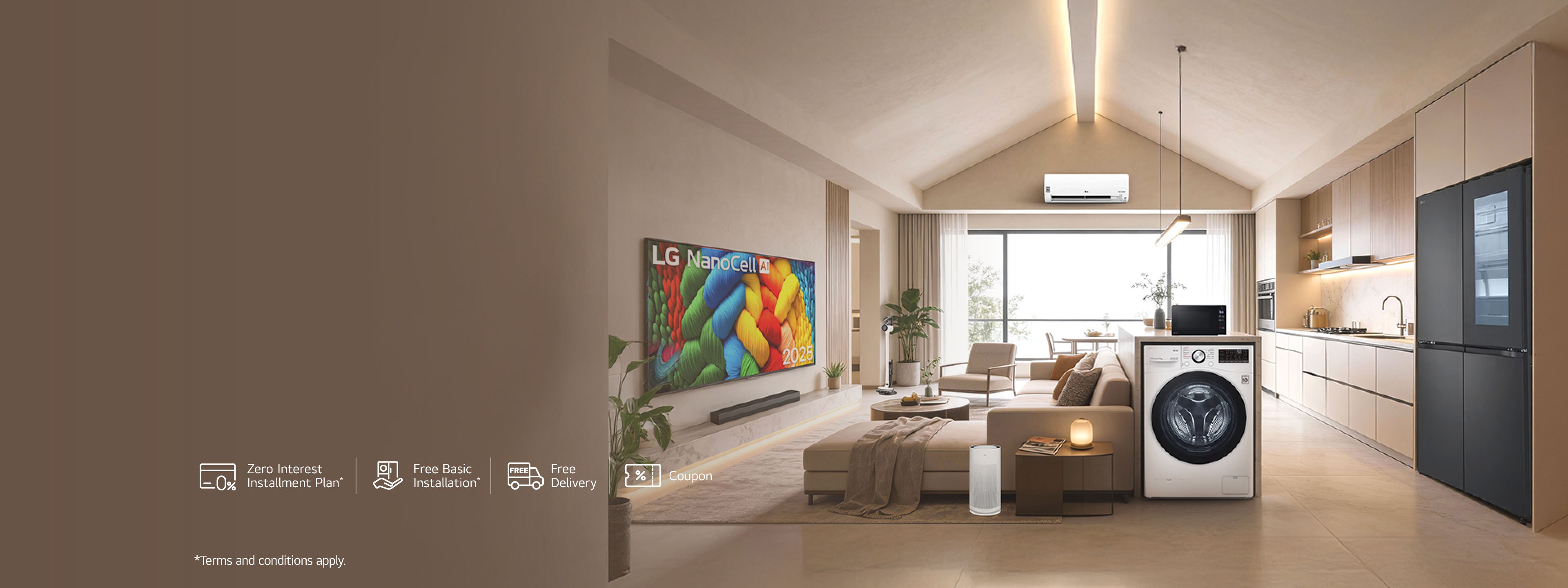 A family is watching a bright aquatic scene on a LG QNED TV with a LG Soundbar, in a bright and natural living space.
