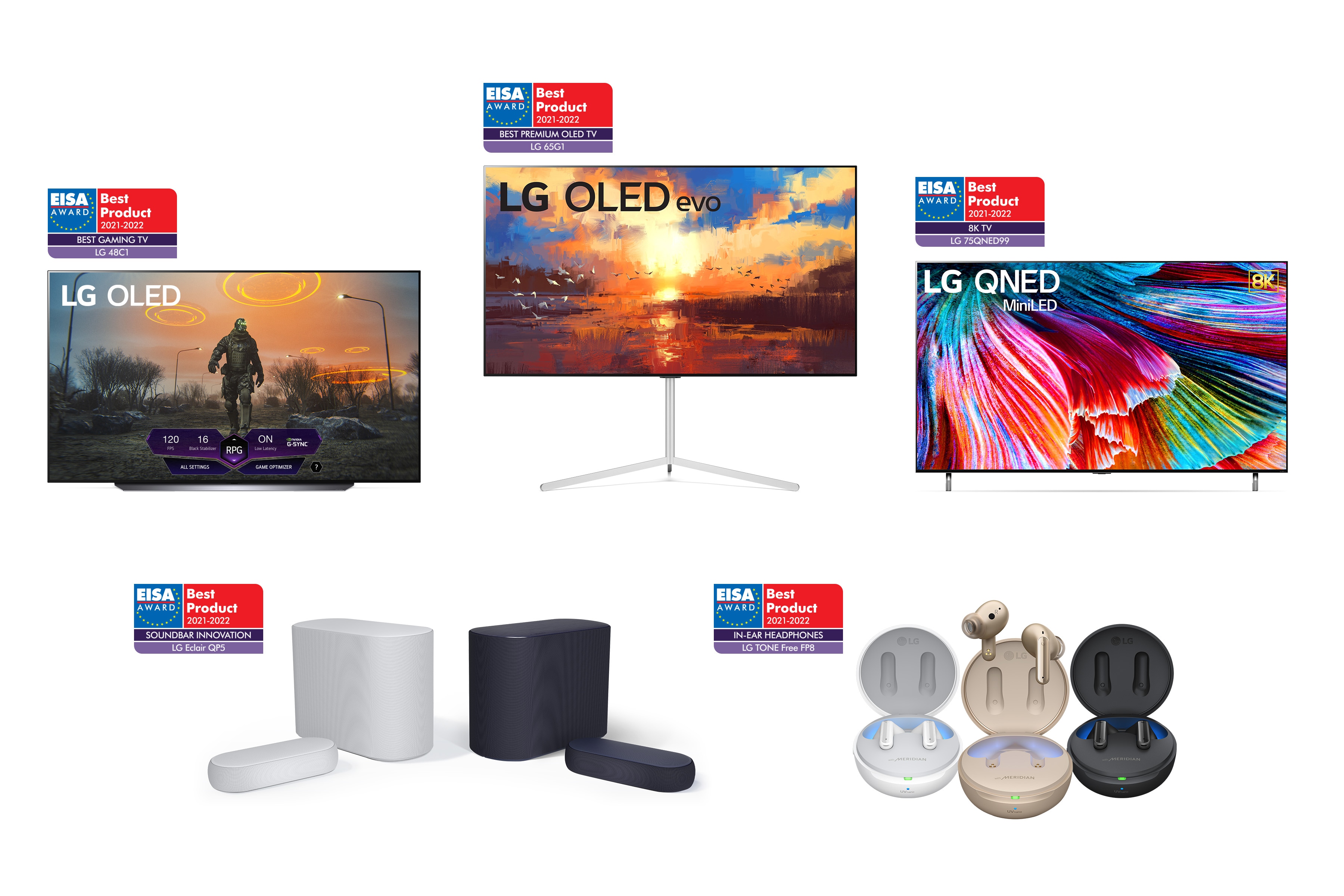 LG Electronics sigue sumando a su impresionante historial de éxito en los premios EISA, cinco de sus innovaciones de entretenimiento en el hogar, ganando elogios para la temporada de premios 2021-2022. Celebrados anualmente por Expert Imaging and Sound Association, la organización editorial de electrónica de consumo más grande del mundo, los premios EISA honraron a los siguientes productos LG por su excelente desempeño y diseño superior: LG OLED TV (modelos OLED65G1, OLED48C1), LG QNED Mini LED TV (modelo 75QNED99), LG Eclair Soundbar (modelo QP5) y LG TONE Free True Wireless Stereo (modelo FP8), próximos a llegar a Perú en octubre.