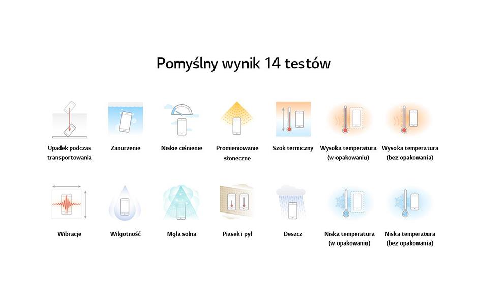 1. Przeszedł 14 różnych testów MIL-STD 810G na wytrzymałość przeprowadzonych przez niezależne laboratorium w USA pracujące według amerykańskich norm wojskowych. W innych warunkach urządzenie może nie zachowywać się tak jak w laboratorium. Test wykonano w kontrolowanym środowisku. Nie należy wykonywać prób na własną rękę.