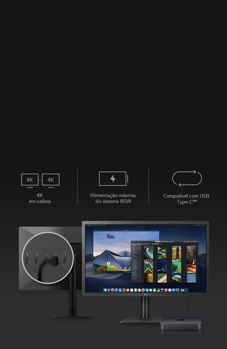 As portas Thunderbolt™ 3 do 24MD4KL são totalmente compatíveis com todos os dispositivos Mac* que suportem Thunderbolt™ 3 e USB Type-C™. E as portas USB Type-C™ oferecem conectividade e alimentação adicional a dispositivos e acessórios compatíveis.