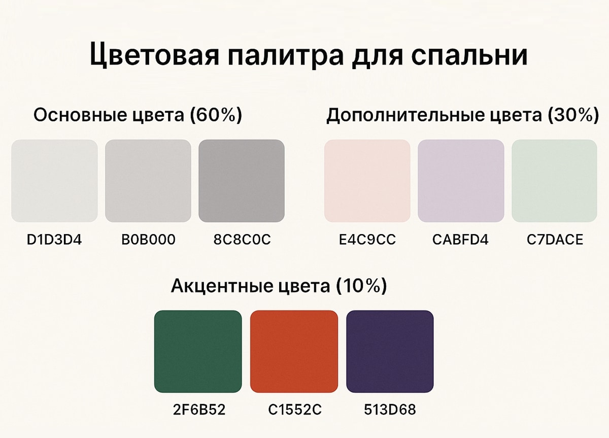 Чрезмерно яркие оттенки бодрят, поэтому их лучше избегать. Но делать спальню слишком «скучной» тоже нежелательно. Для гармоничного подбора оттенков пользуйтесь правилом: 60% основного цвета, 30% дополнительного, 10% акцента. В маленькой спальне используйте больше светлых тонов, чтобы визуально расширить комнату.