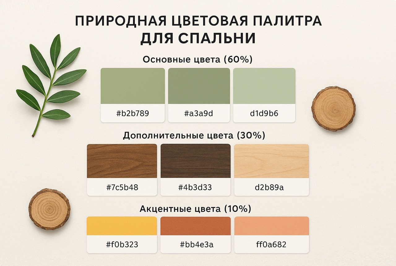 Природная гамма позволяет гармонично вписать в пространство спальни мебель из натурального дерева. Основной тон зелёный, дополнительный коричневый (предметы тёмной полировки), акцент – один из оттенков спелых плодов (например, жёлтый или красный).