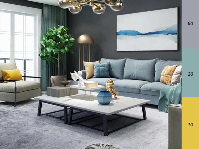 Базовое правило выбора цветовой палитры для интерьера гостиной – 60-30-10. Основной тон занимает 60% поверхностей, дополнительный – 30% и акцентный – всего 10%. Этот принцип позволяет избежать двух зол: пёстрого и чрезмерно монотонного оформления.