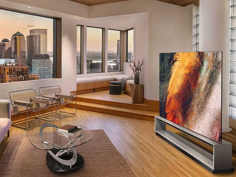Для минималистичного интерьера подойдёт сворачиваемый телевизор OLED65R19LA. Или можно создавать изображение с помощью проектора CineBeam Q. Он компактен, прост в использовании, показывает картинку диагональю до 120 дюймов.