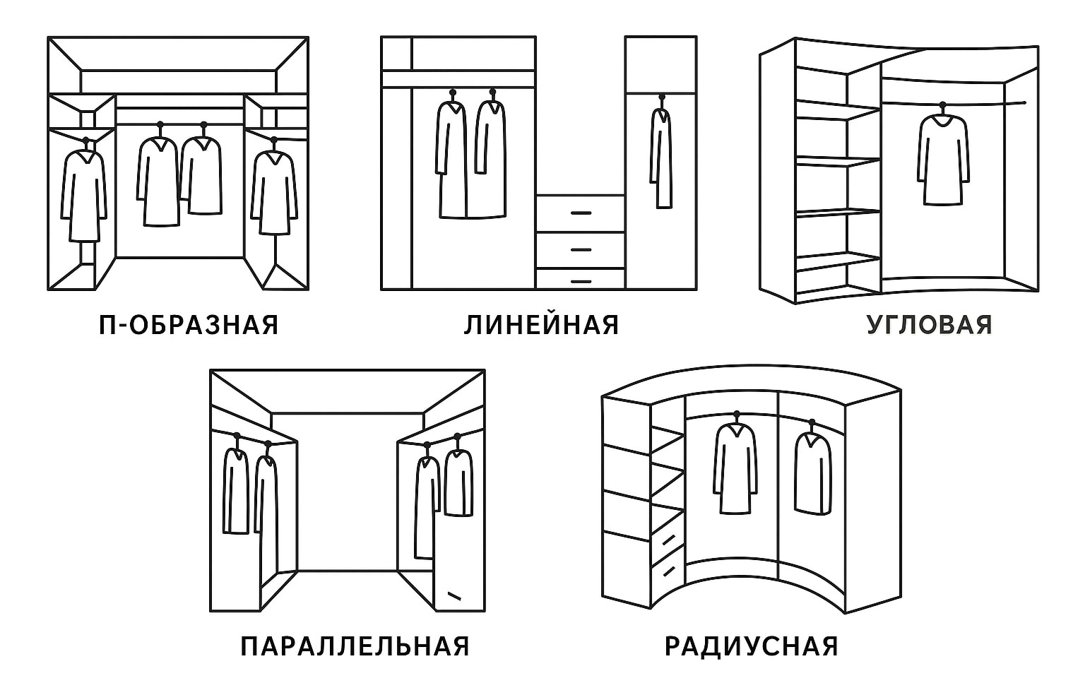 Линейная планировка (вдоль одной стены) подходит для узких пространств, подобных коридору, и прямоугольных помещений. В спальне зону гардероба отделите ширмой.