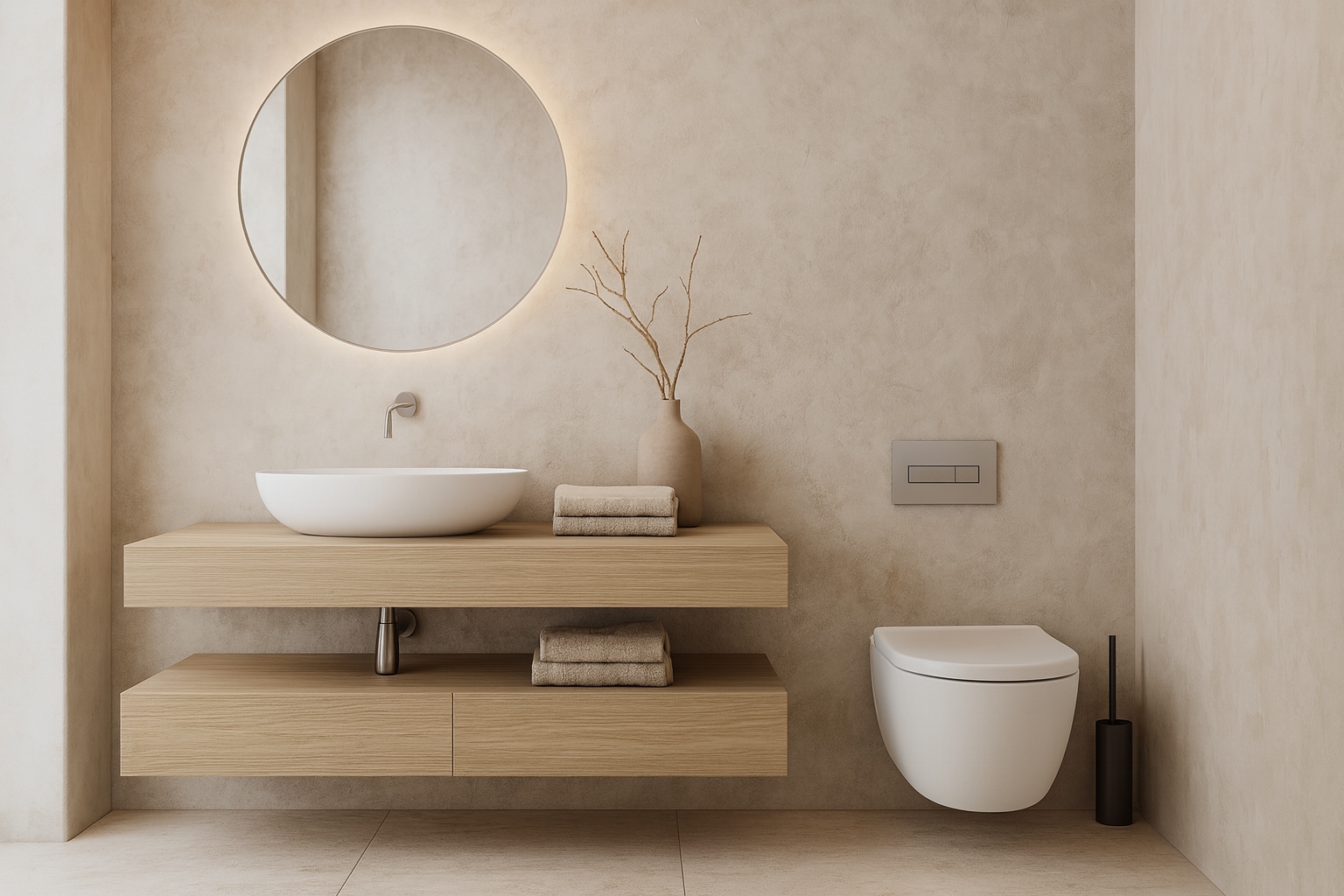 Джапанди называют сочетанием скандинавского уюта и японской философии. На полу матовый керамогранит, стены под природный камень или глину, мебель лаконичная и строгая, сантехника с плавными обводами. Минимум декора — даже зеркало лучше брать без рамки.