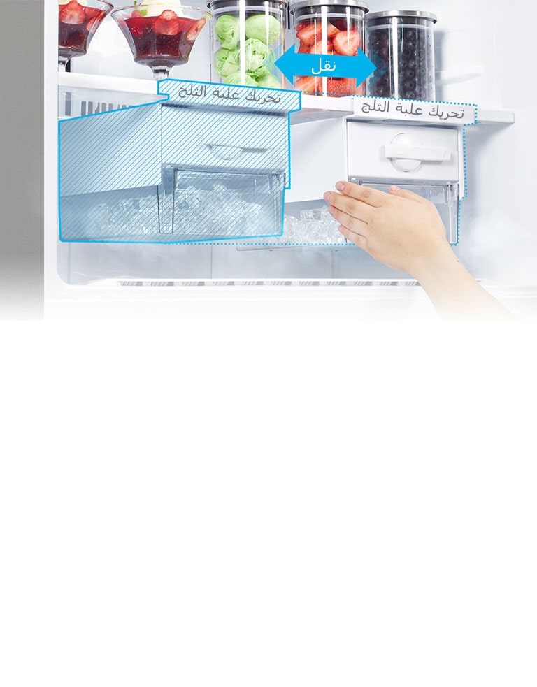 تحتوي ثلاجة إل جي المزودة بمجمّد علوي على صانع ثلجي قابل للفصل والتحريك يمكنك إزالته وتحريك علبة الثلج هذه في أي وقت تحتاج فيه إلى مساحة أكبر في المجمّد.
