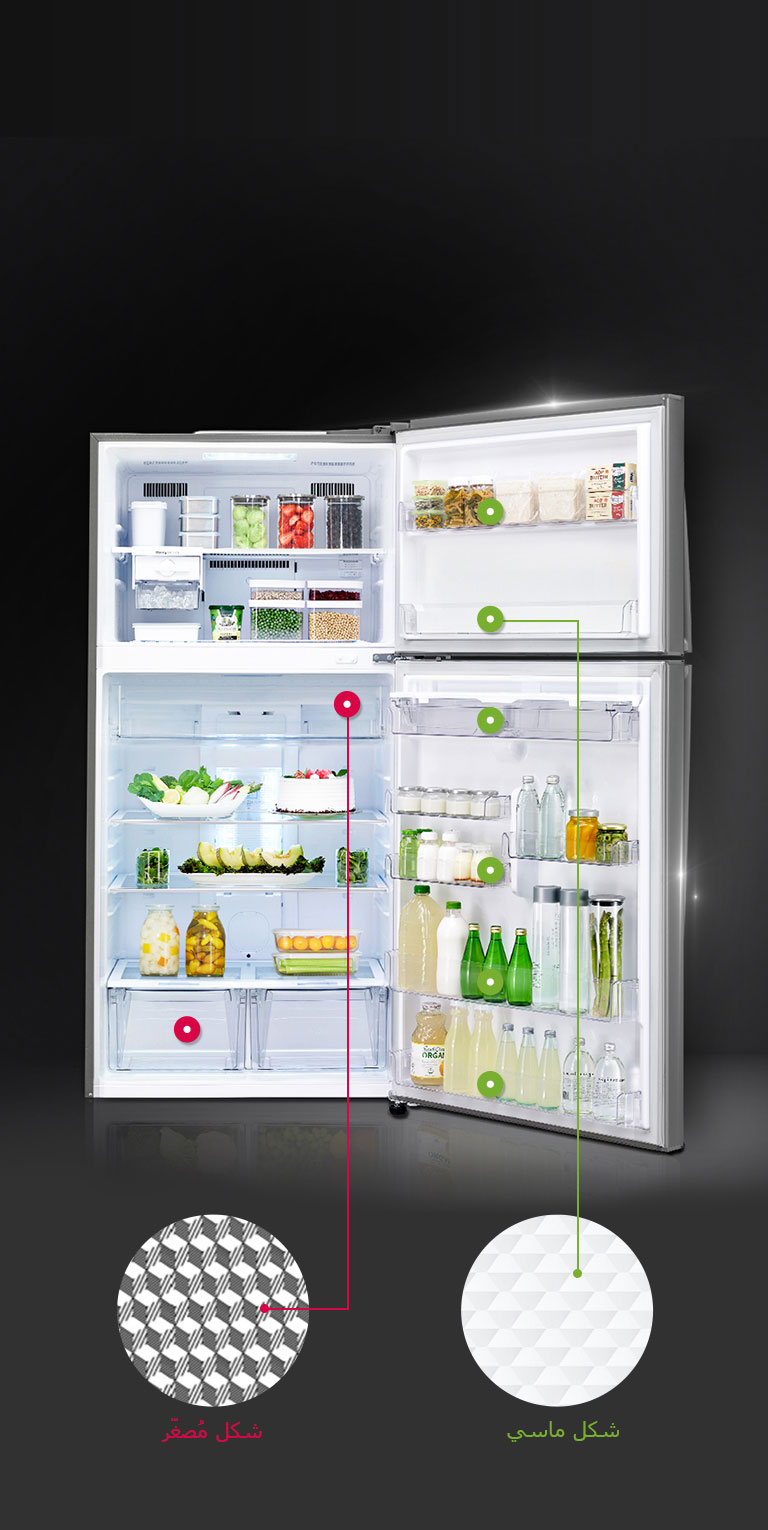 تتميز إضاءة LED بكونها أكثر كفاءة في استخدام الطاقة وبمدى عمر أطول من إضاءة المصابيح التقليدية. تضاعف المساحة في الأعلى في المجمّد وفي الجزء الخلفي من الثلاجة للحصول على إضاءة أفضل حتى في ظروف الامتلاء بالطعام.