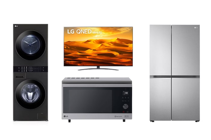 تلفزيون LG QNED 65 بوصة + ثلاجة جنباً إلى جنب 22.8 قدم مكعب + WashTower من LG 13/10 كجم + فرن الميكروويف NeoChef 39 لتر