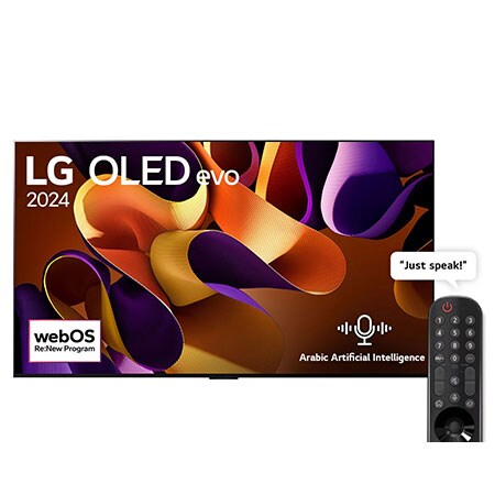 Front view with LG OLED evo TV, OLED G4, 11 Years of world number 1 OLED Emblem, and 5-Year Panel Warranty logo on screen