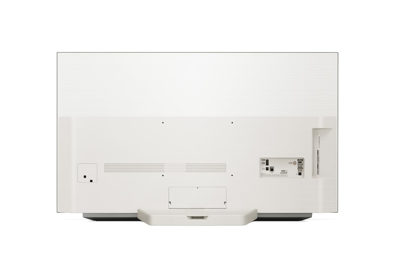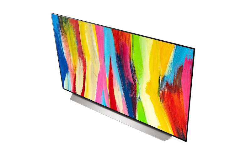 En LG OLED C2 med golvstativ står i hörnet av ett mintfärgat rum. En LG OLED C2 med galleri-fästet står framför ett stort fönster i ett modernt rum. En LG OLED C2 står på en TV-möbel i vintagestil i ett limegrönt rum med färgstark konst och möblering. En närbild där nedre delen av LG OLED C2 ses i vinkel.