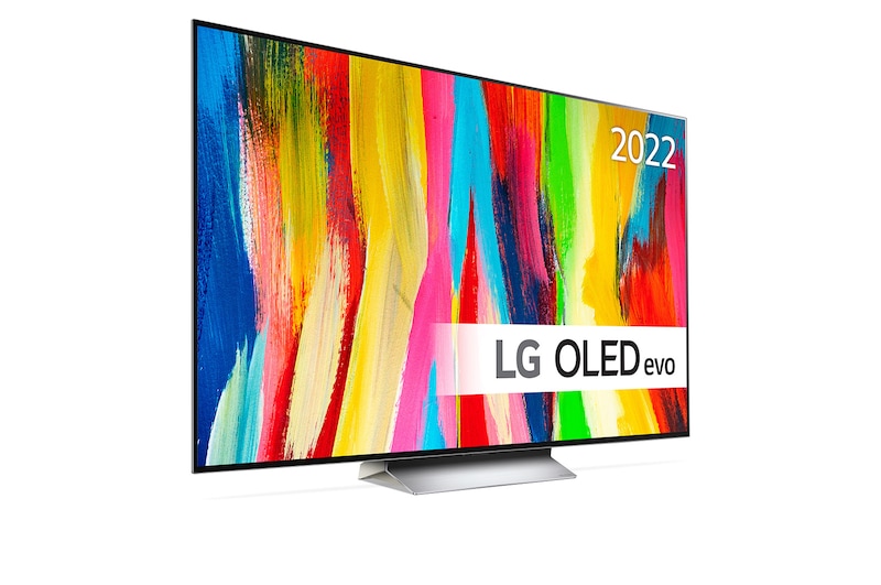 En LG OLED C2 med golvstativ står i hörnet av ett mintfärgat rum. En LG OLED C2 med galleri-fästet står framför ett stort fönster i ett modernt rum. En LG OLED C2 står på en TV-möbel i vintagestil i ett limegrönt rum med färgstark konst och möblering. En närbild där nedre delen av LG OLED C2 ses i vinkel.