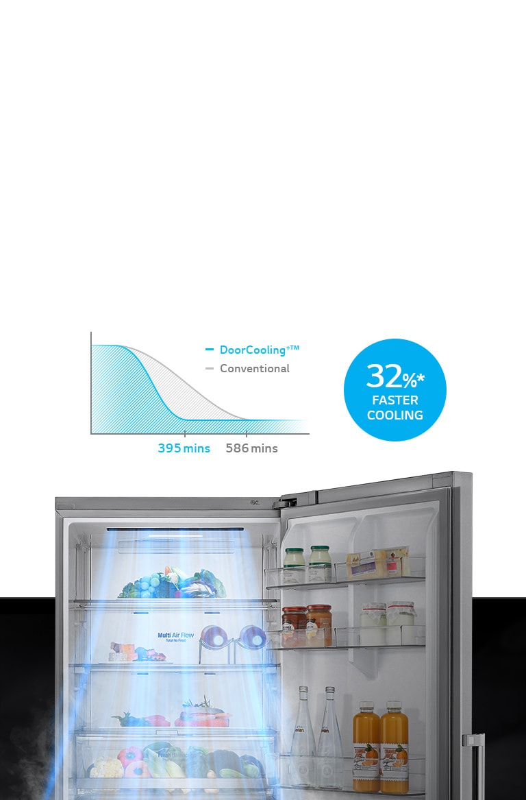 *Based on UL test results using LG's internal testing method comparing the time needed for temperature of the top door basket to drop from 24.8℃ to 8℃ between LGE's Non-DoorCooling+™ model (GBB60NSZHE) and DoorCooling+™ model (GBB72NSDFN).