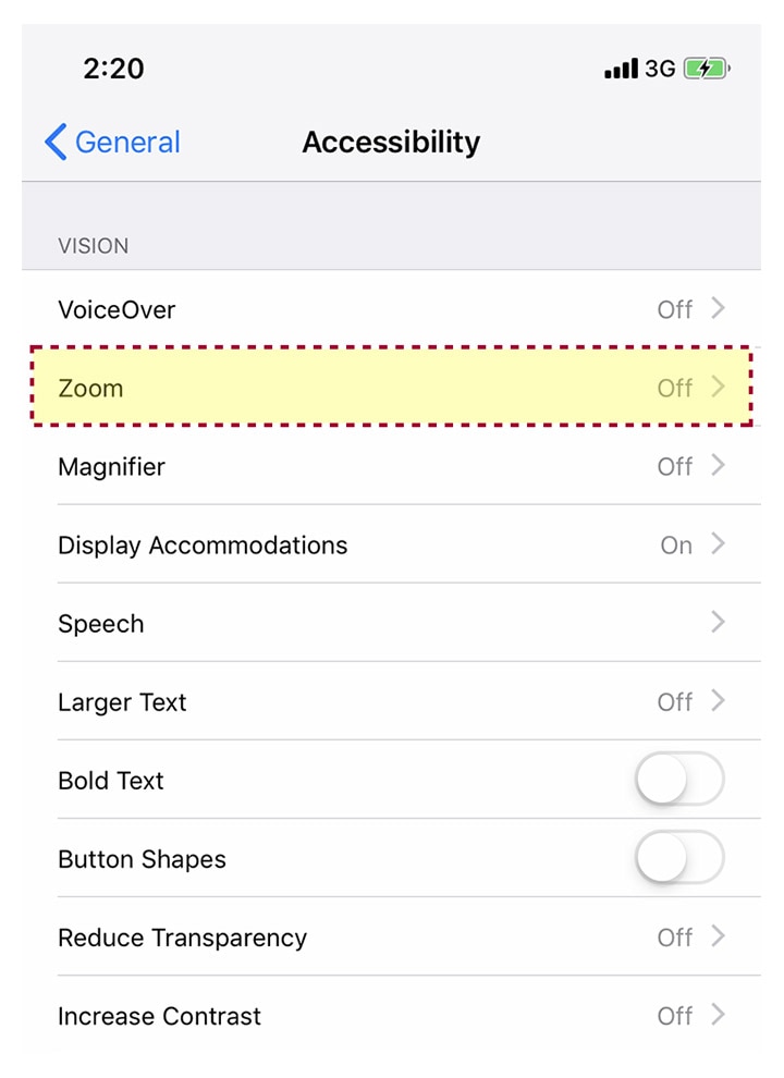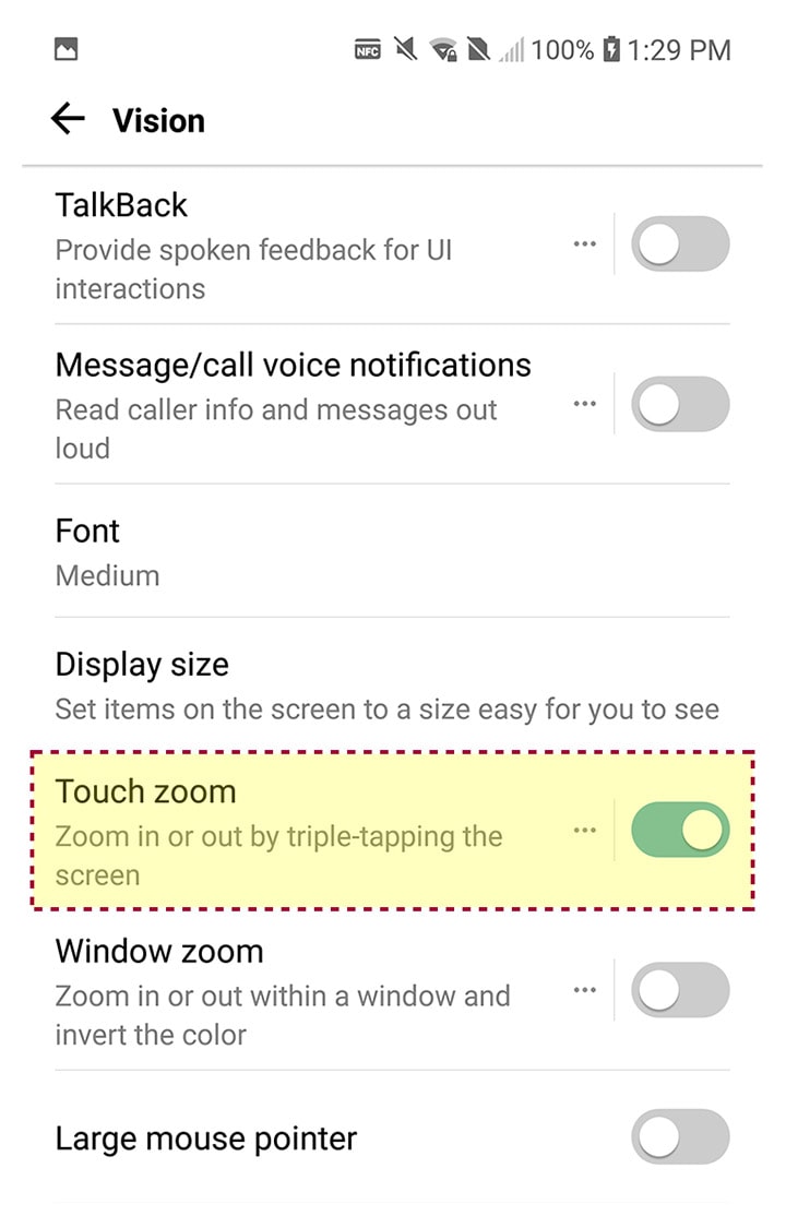 - 04.Pod hlavičkou „Zväčšiť objekty na obrazovke“ kliknite na okno vedľa „Zapnutie Lupy“.