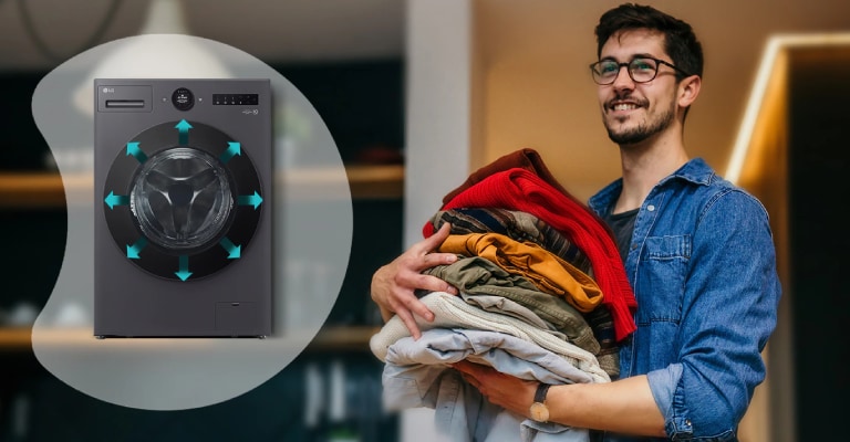 6. ทำความสะอาดเสื้อผ้าด้วยเครื่องซักผ้าอบผ้าในตัว ช่วยลดการสะสมของฝุ่นตามเสื้อที่อาจเกิดจากการตากผ้ากลางแจ้งได้