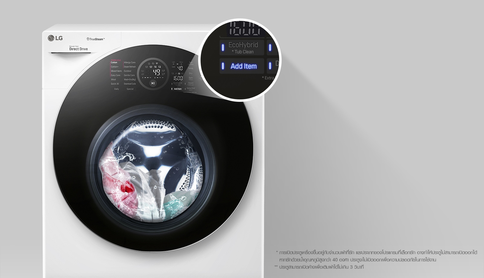 * ทดสอบในห้องปฏิบัติการ LG ; อิงตามรอบซักผ้าฝ้าย 40 ℃/1400 รอบต่อนาที การเปรียบเทียบระหว่าง ' TurboWash™' และ 'ไม่มี TurboWash™' (ความจุครึ่งหนึ่ง)