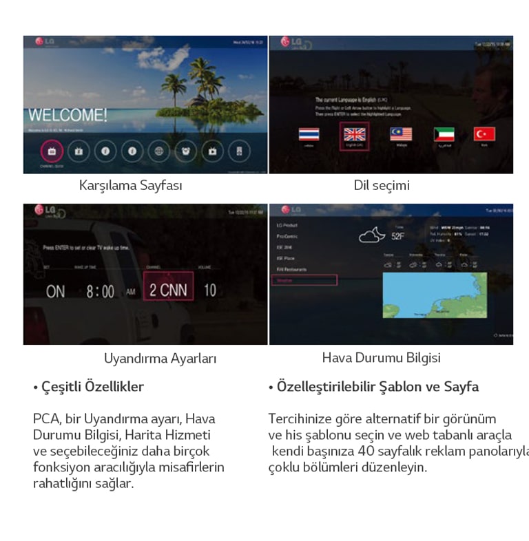 Otel Modu, Kilit Modu, Karşılama Ekranı, Görüntü Ekle, Harici Hoparlör Çıkışı, Anında Açılış, Tek Kanal Harita, Harici Güç, RJP Uyumluluğu, Harici Saat Uyumluluğu, RTC (Gerçek Zaman Saati), webRTC Hazırlığı