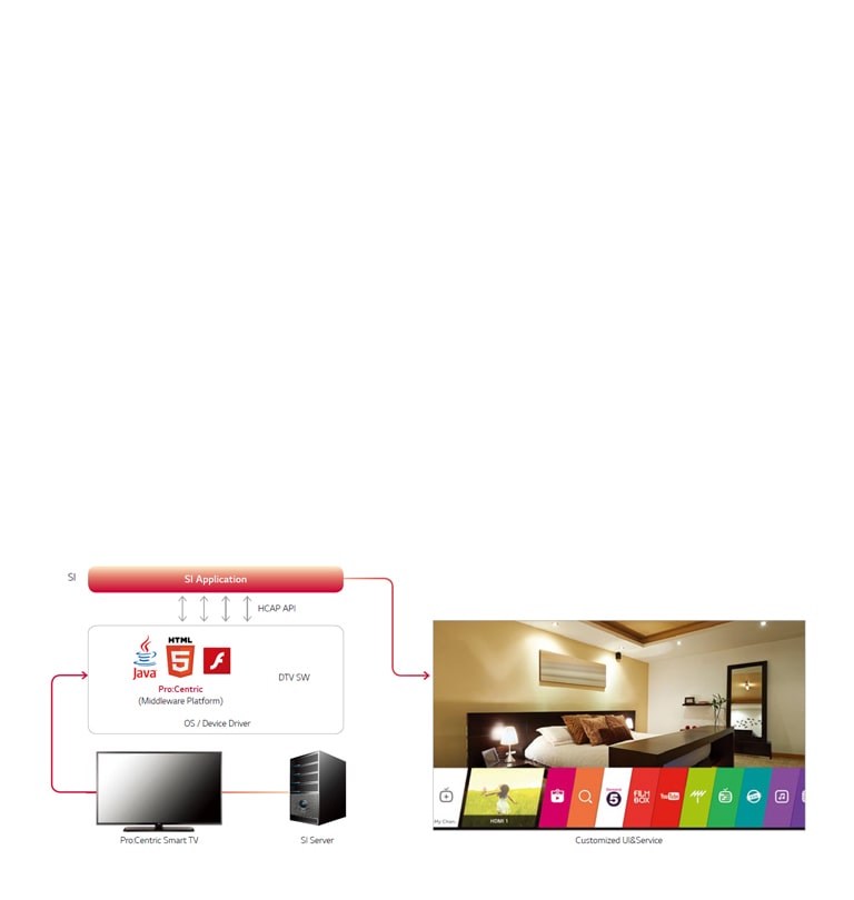 LG Pro:Centric SMART genişletilmiş özelleştirilebilir araçlar sunar; HTML5, Java ve Flash. Bunlarla birlikte, iş ortakları, Ticari TV'leri kendi geliştirilmiş hizmet tasarımlarını düzenlemek ve geliştirmek için optimize edebilirler. Ayrıca, kullanıcılar üzerinde görsel bir etki bırakır ve istenilen mesajları iletir.