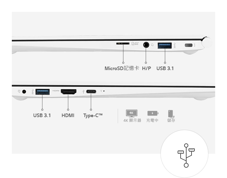 USB 3.1 Type C™ (USB PD), <br/> USB 3.1 Gen2 (x2),<br/> Standard HDMI, Micro-SD, HP-Out,<br/> (附RJ45轉接頭)