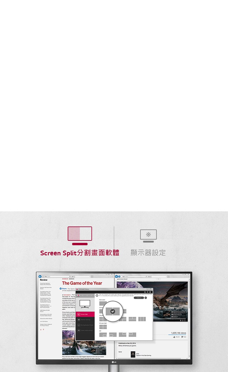 智慧螢幕操作(OSC) 軟體讓您恣意的使用滑鼠,來控制各種顯示設定,擺脫現有單一選鈕不易的操作方式。螢幕畫面分割功能,也將協助您輕鬆劃分整個顯示區域,達到有效多工作業。