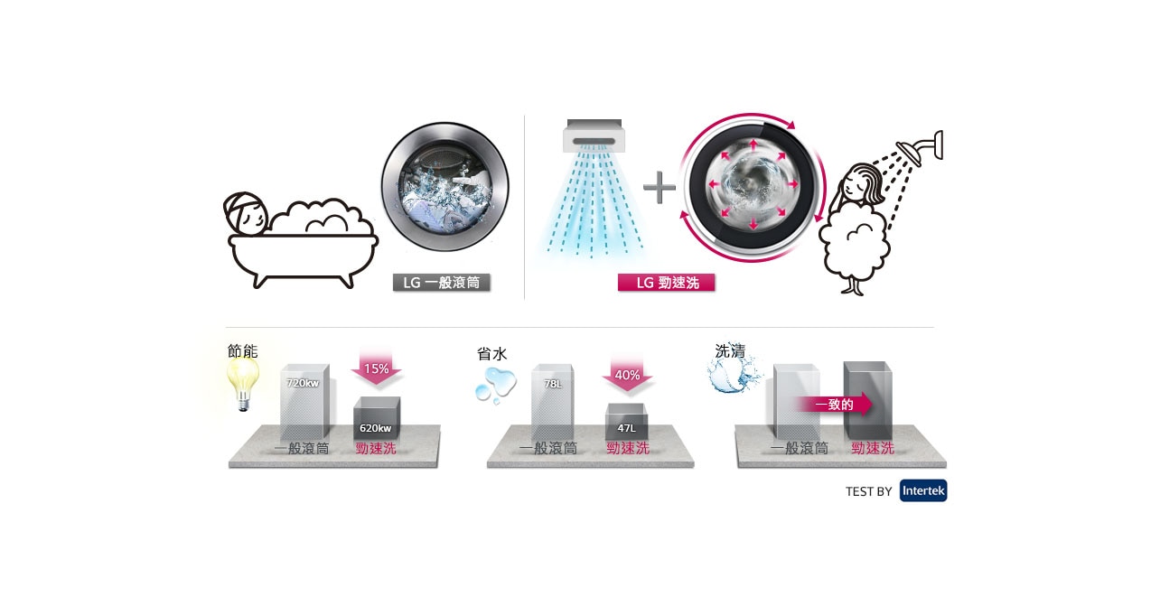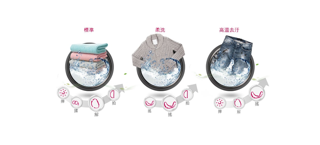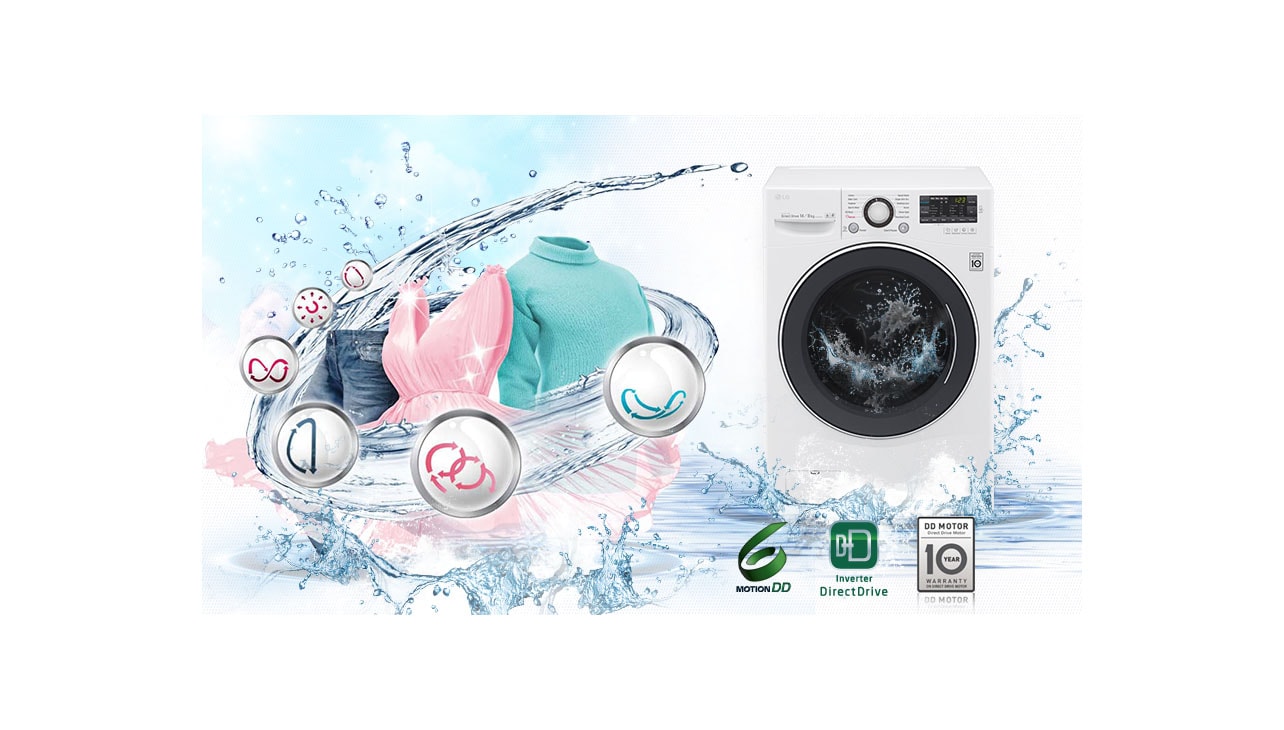 LG DD直驅變頻馬達,可智慧模擬媽媽拍、搓、揉、搖、擰、解六種手洗動作,能為不同質料及髒汙程度組成適用的行程,讓衣物不僅潔淨,還能充分呵護衣物。